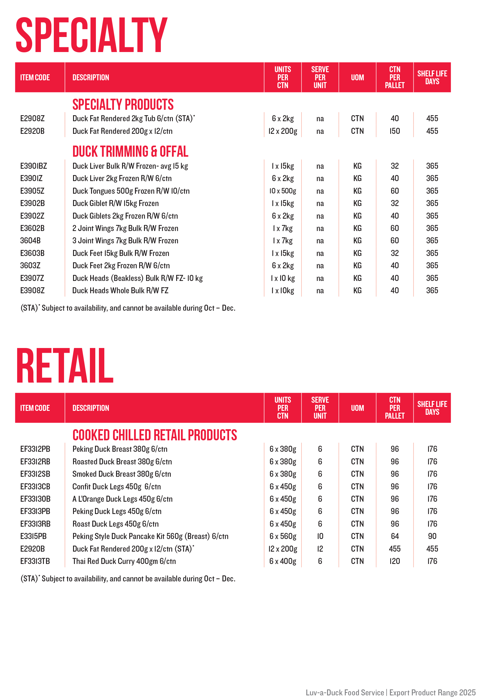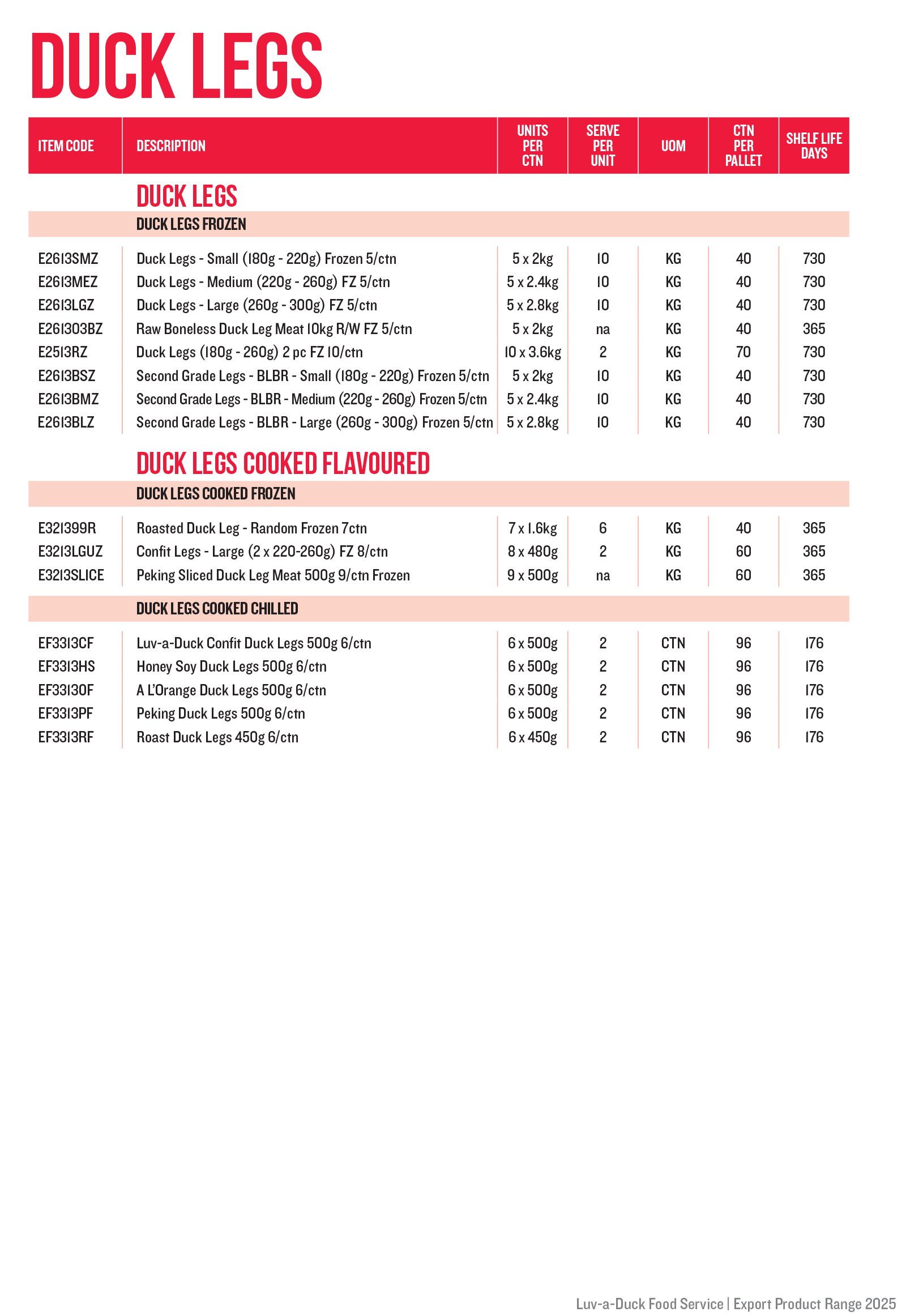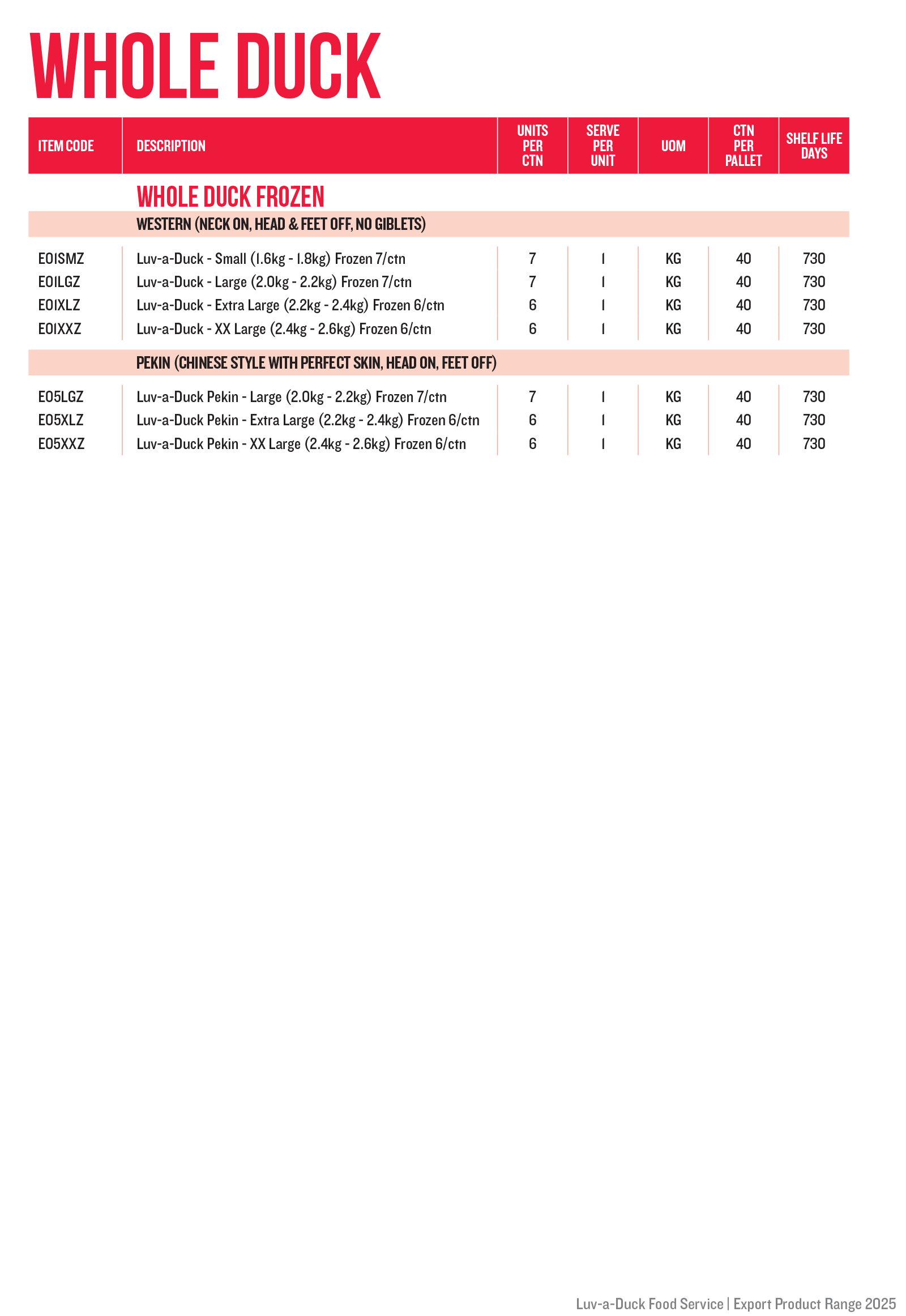Luv-a-Duck Food Service range includes Whole Duck, Breast and Legs in both raw and pre-cooked varieties. All products can be frozen for up to 24 months shelf life.